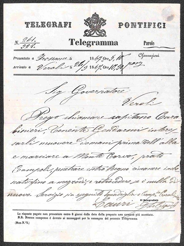 Telegrafi Pontifici - 1867 (24 marzo) - Ordine di Servizio da Frosinone a Veroli