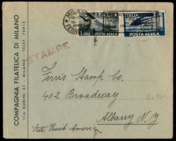 1 lira + 5 lire Posta Aerea (126 + 129) su busta aperta in tariffa stampe per l'estero da Milano per gli UDA del 14.1.1947