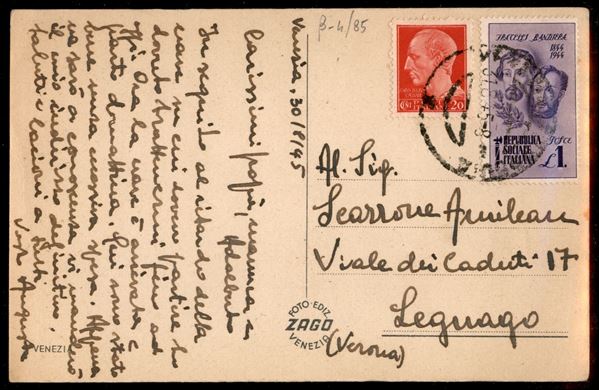 1 lira Bandiera + 20 cent Imperiale su cartolina da Venezia del 31.8.45 per Legnago