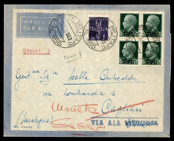1 lira P.M. Aerea (15) + quartina 25 cent P.M. (5) su aerogramma da Posta Militare N.155 per Cagliari del 23.11.1944