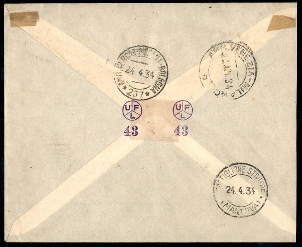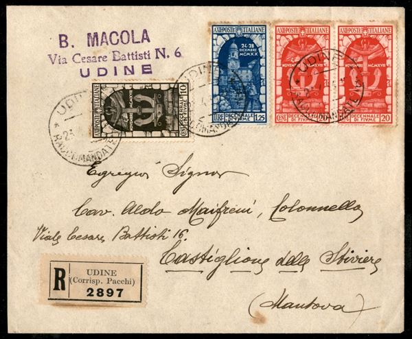 10 cent + coppia 20 cent + 1,25 lire Decennale di Fiume (350/51 + 353) su raccomandata per Castiglione delle Stiviere da Udine del 23.4.34