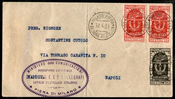 10 cent + due 20 cent Decennale di Fiume(350/51) su lettera per Napoli annullati Milano Fiera Sezione Filatelica 12.4.34 - in tariffa