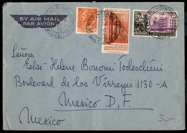 10 lire Siracusana + 60 lire Petriolo + 60 lire FAO (764 + 780 + 787) su lettera via aerea per il Messico da Catania del 17.3.959