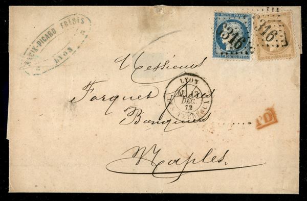 15 cent Napoleone (59) + 25 cent (60) su busta da Lione a Napoli 13.12.72 viaggiata col vapore Eridan