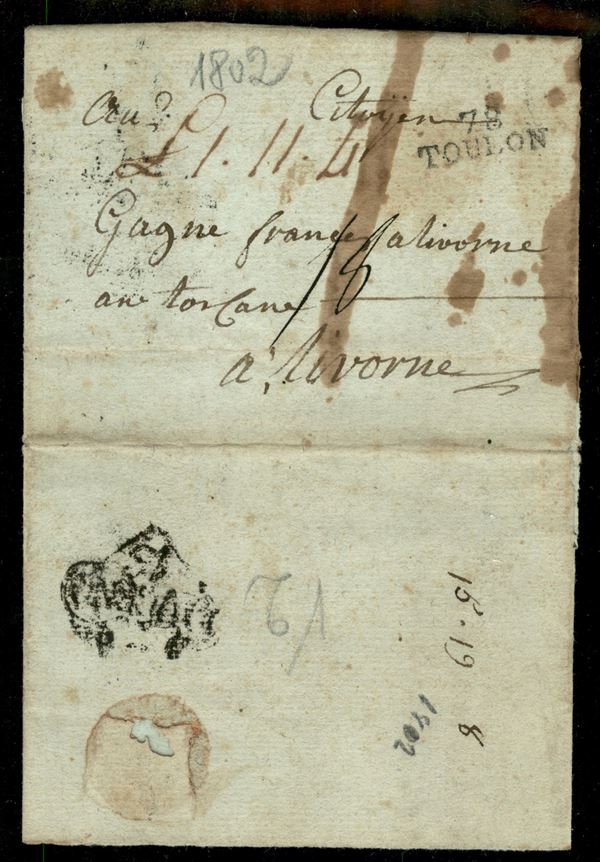 1802 - Lettera con bollo 78 TOULON per Livorno con manoscritto £.1.11.4 e segno di tassa 18 - al verso bollo Cuore di Livorno