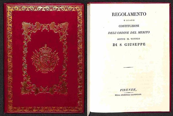 1817 (1 agosto) - Costituzioni dell'Ordine del Merito di S. Giuseppe - Firenze/Stamperia Granducale - opuscolo di 28 pagine - rilegatura d'epoca con fregi in oro - conservazione perfetta