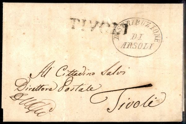 1849 - Repubblica Romana - Direzione / di / Arsoli (Ovale) - Lettera in franchigia per Tivoli del 31.5.49