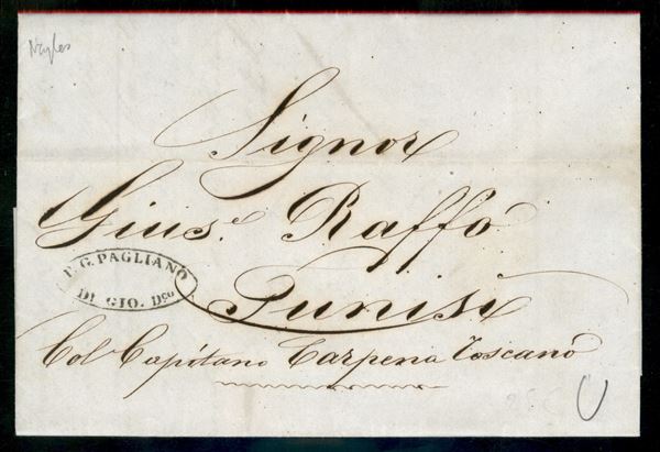 1851 Lettera da Napoli 7 mag. per Tunisi con manoscritto "Col Capitano Carpena Toscano" - fresca