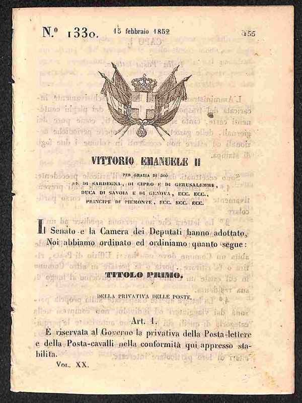 1852 (15 febbraio) - Privativa delle Poste lettere e della Posta cavalli - Decreto 1330 - 20 pagine