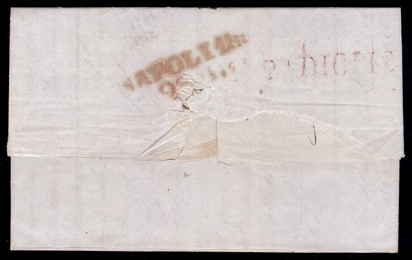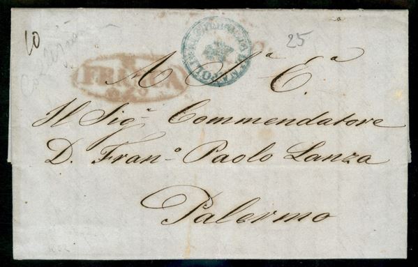 1852 Lettera da Napoli 20 dic. con ovale Franca in rosso e bollo azzurro della Posta di Napoli via di mare per Palermo