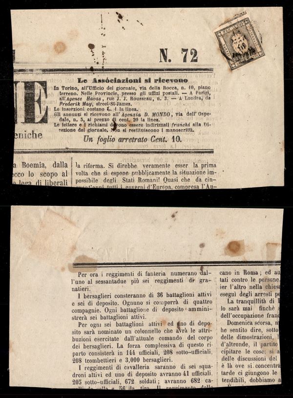 1861 - 2 cent (20a - nero) usato su frammento di giornale (475)