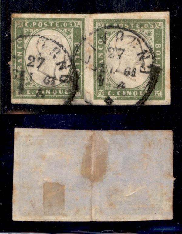 1861 - 5 cent (13Ca - oliva chiaro) - coppia usata a Livorno (500)
