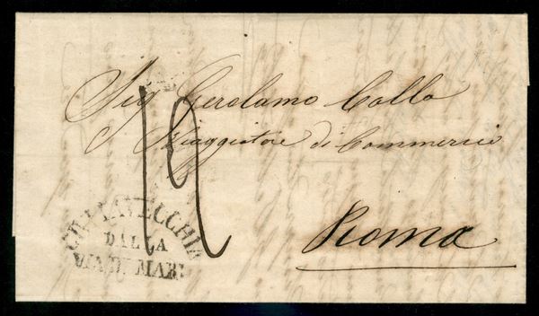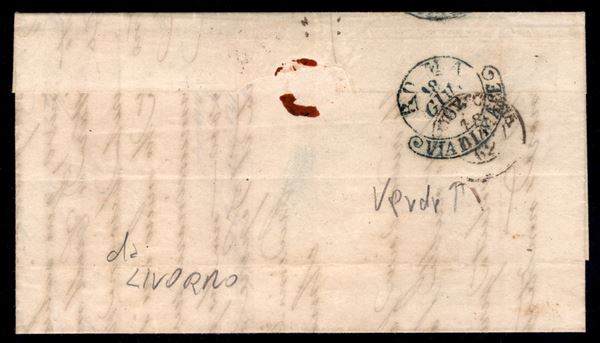 1864 Lettera da Livorno 17 giu. per Roma con transito di Civitavecchia e segno di tassa - al verso bollo con bandella