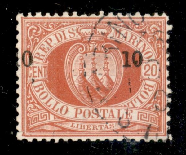 1892 - 10 cent su 20 Stemma (11) usato - soprastampa spostata (0 10) - ben centrato