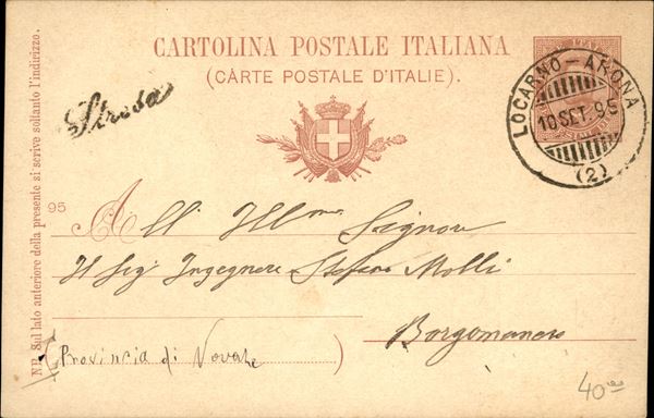 1895 Corsivo Stresa su cartolina postale Umberto 10 cent per Borgomanero con guller Locarno-Arona (2) 10 sett. 95
