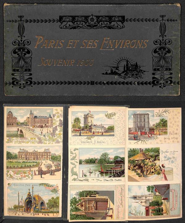 1900 - Paris et ses Environs - Souvenir - Depliant (29x15) con copertina rigida - completo delle 39 vedute formato cartolina (ripiegate a fisarmonica) - perfette condizioni di conservazione