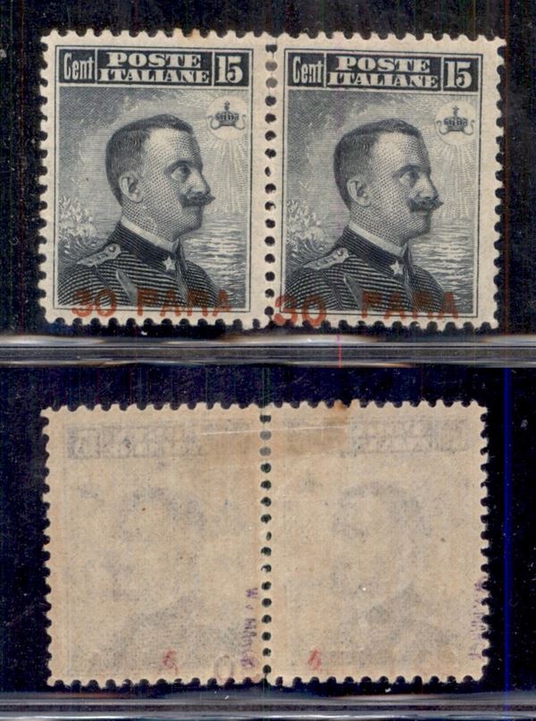1908 - 30 para su 15 cent Michetti (15a varietà cb + 15ag - carta sottile) - coppia orizzontale con soprastampe in basso + cifra spaziata a destra - gomma originale