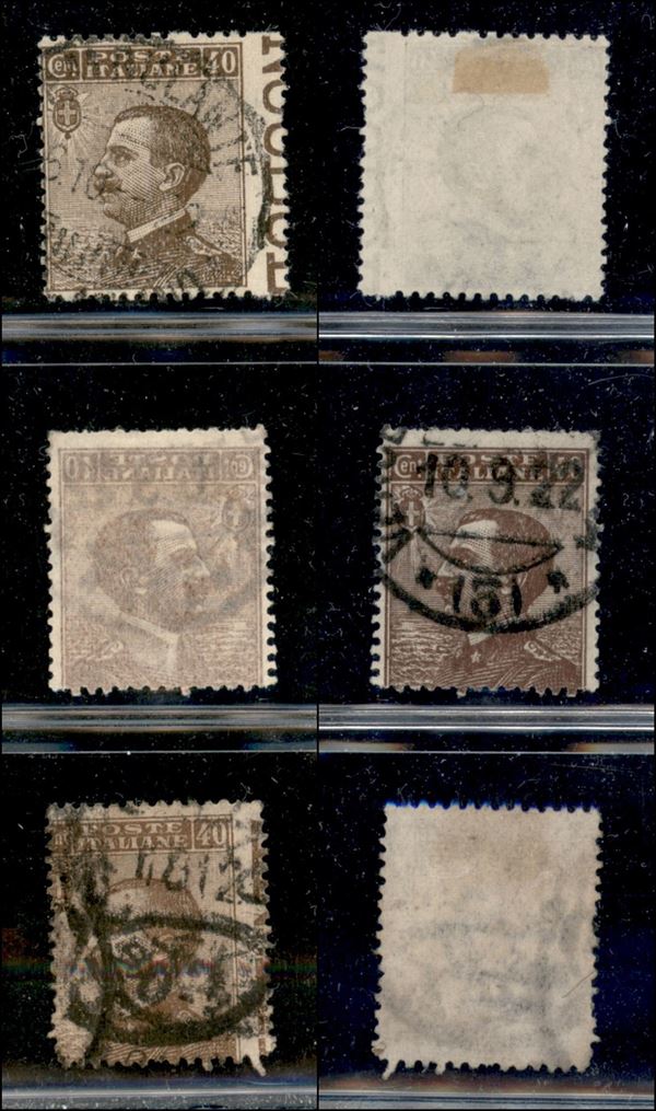 1908 - Tre 40 cent Michetti (84 varietà) usati - decalco (84p) + dentellatura verticale spostata a destra (con scritte marginali) + dentellatura destra spostata a margine per salto del pettine