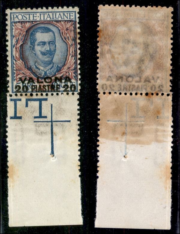 1909 - 20 piastre su 5 lire Floreale (7) - bordo di foglio - gomma integra con qualche ingiallimento (187)