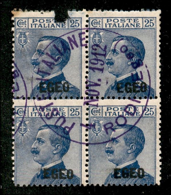 1912 - 25 cent (1) - quartina usata a Rodi (1.11.12 - viola) - pezzo superiore sinistro difettoso