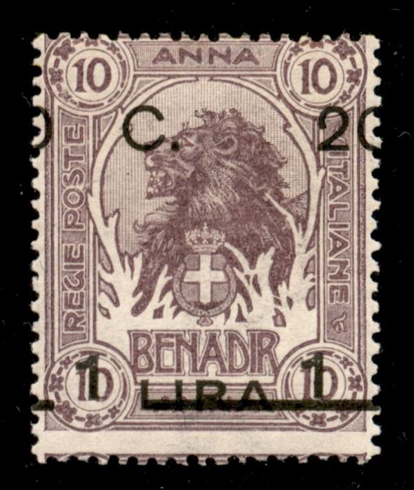 1916 - 20 cent su 1 lira /10 anna (18d) con soprastampe spostate (a cavallo) - gomma integra