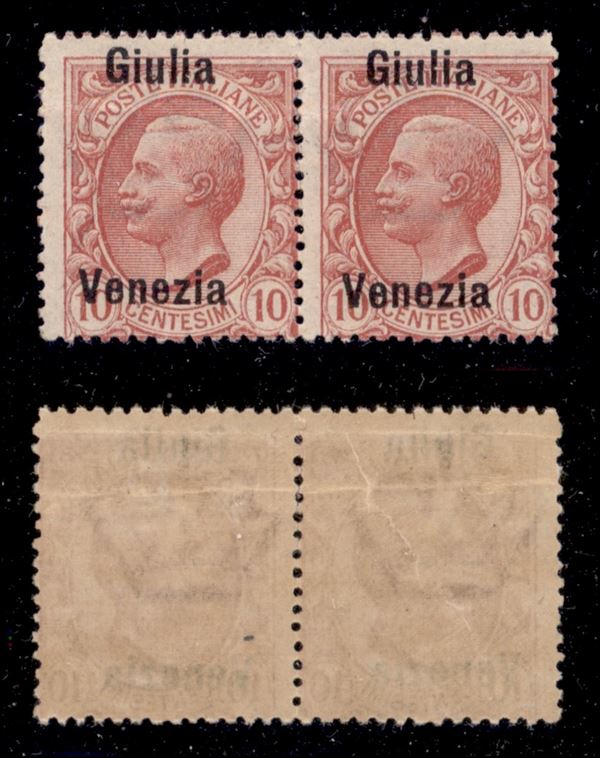 1918 - 10 cent Leoni (22d) - coppia orizzontale con soprastampe invertite - gomma integra - piega di gomma orizzontale in alto