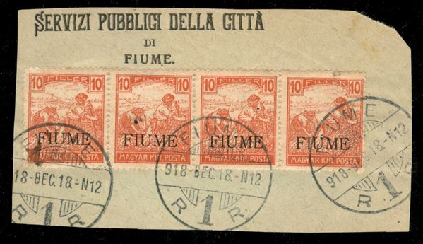 1918 - 10 filler (1A) - striscia orizzontale di 4 usati su frammento