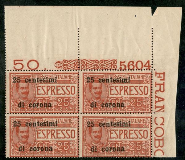 1919 - 25 cent su 25 cent Espresso (1) - quartina angolo di foglio con numero di tavola (5604) - gomma integra