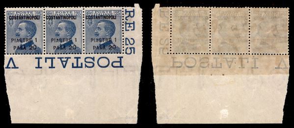 1923 - 1,20 piastre su 25 cent (77 - varietà) - striscia angolare di 3 - Costantinopoli spostato a sinistra nei due pezzi di destra - gomma integra - non catalogato