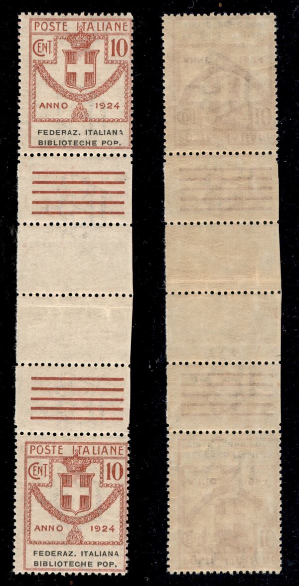 1924 - 10 cent Biblioteche Pop. (34) - coppia verticale con interspazio al centro - gomma integra