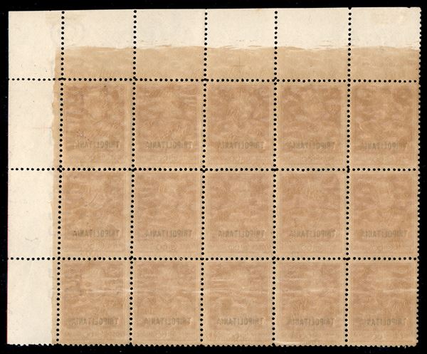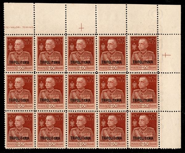 1925 - 60 cent Giubileo (23) - blocco angolare di 15 con filigrana intera lettere (23a - MINISTERO) a cavallo sui tre di destra - gomma integra