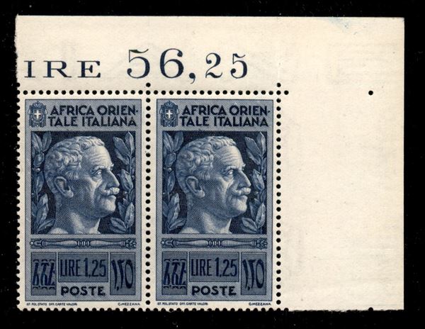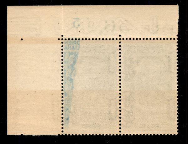 1938 - 1,25 lire Pittorica (13) - coppia angolare con parziale decalco diagonale spostato (5 + Orien + Lana) in pos. 10 - gomma integra con lievi imperfezioni - non catalogato