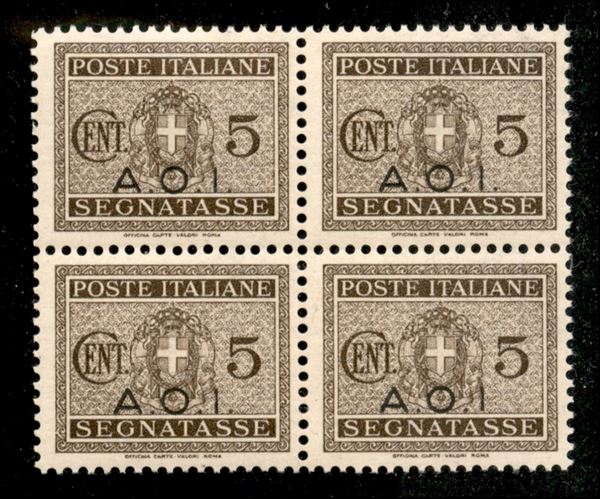 1939 - 5 cent Segnatasse (1 + 1a) in quartina - senza punto dopo I (pos. 100) - gomma integra