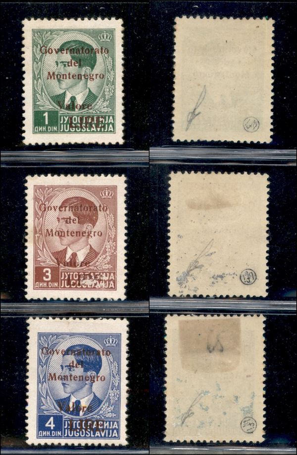 1942 - Soprastampa carminio - 3 valori (50 + 53 + 54) - gomma originale - 3 lire con lievi abrasioni al recto - firma + timbrino di garanzia bfi