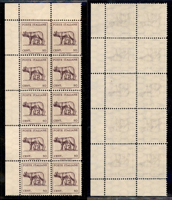 1943/1944 - 50 cent Lupa (515 + 515A) in blocchi verticali di 10 - senza gomma