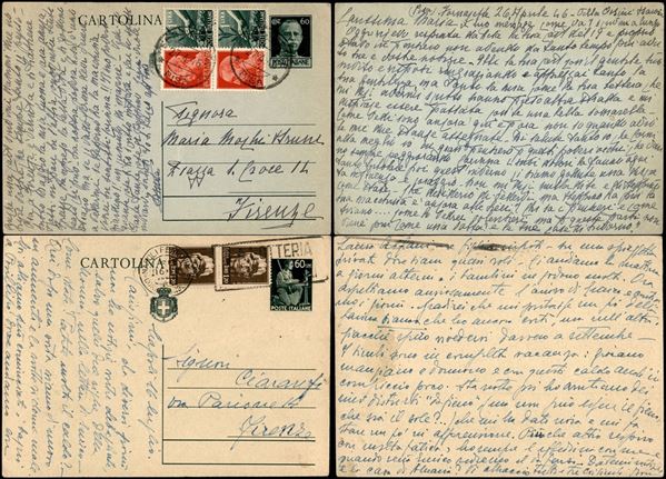 1946 – Due cartoline postali (113A + 126A) con complementari da Pisa (27.4) e Napoli (16.7) per Firenze