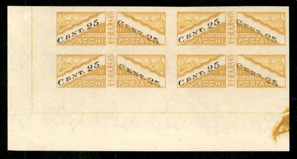 1946 - 25 cent Pacchi Postali (19/II b) - quartina angolo di foglio non dentellati - gomma integra