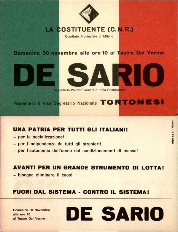 1946 - La Costituente (C.N.R) - Milano 30 Novembre teatro del Verme - De Sario - volantino tricolore