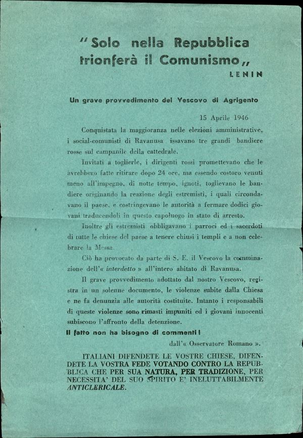 1946 - Solo nella Repubblica Trionferą il Comunismo - volantino su carta verde
