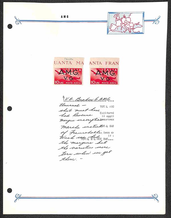 1947 - Due 10 lire (5 - Aerea) - G rotta in alto - diversi per posizione nel foglio - gomma integra - con linguella (sul bordo) su foglio d'album