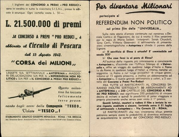 1947 (15 agosto) - Concorso a premi "Pro Reduci" - circuito di Pescara - volantino lanciato dagli aerei della compagnia Teseo