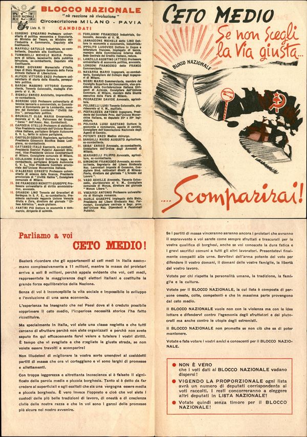 1948 - Blocco Nazionale - P.L.I. - Ceto Medio se non scegli la via giusta Scomparirai - Milano - volantino illustrato a opuscolo