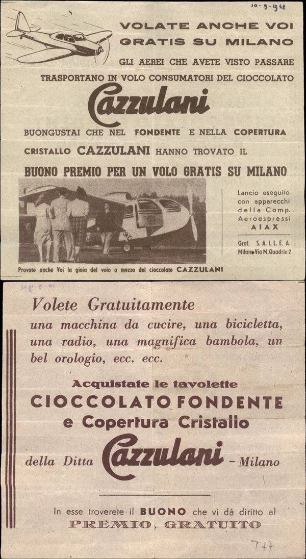 1948 - Cazzulani cioccolato Milano - volate anche voi gratis su Milano - volantino lanciato dalla compagnia Aeroespressi AIAX