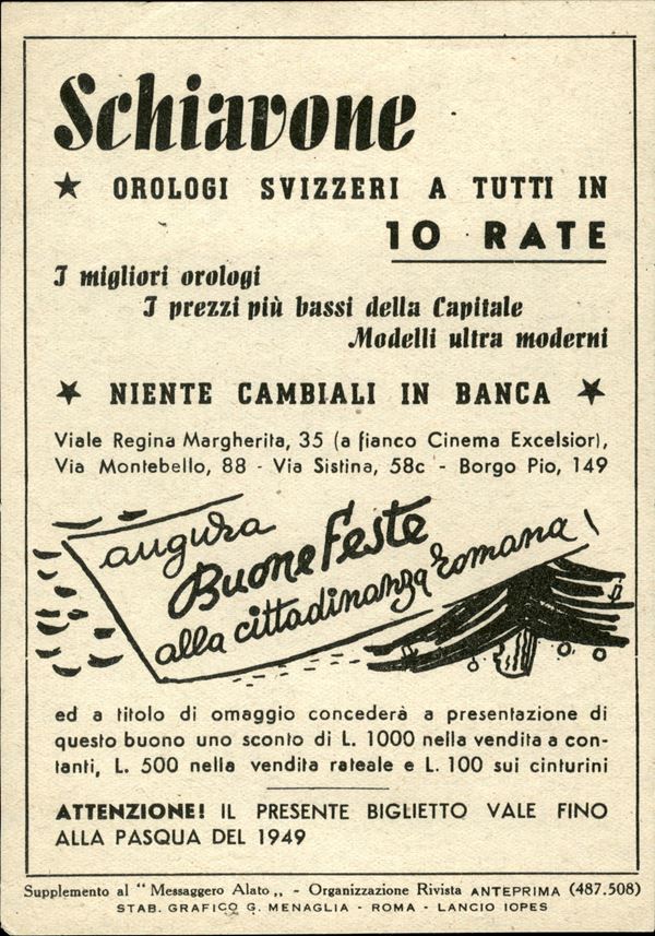 1948 (Natale) - Schiavone - orologi svizzeri - supplemento al Messaggero Alato - volantino