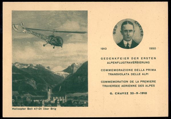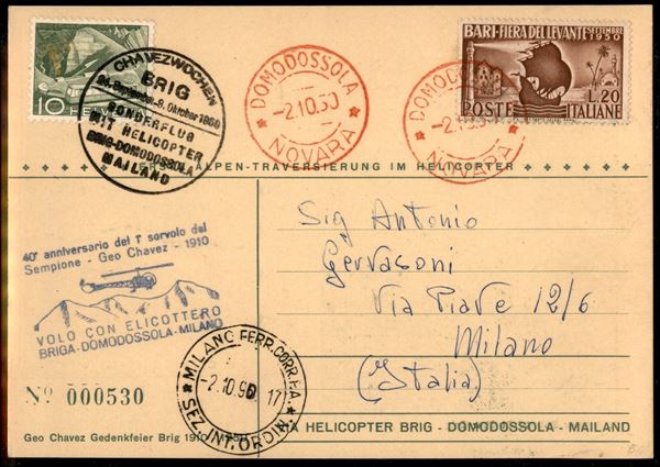 1950 Volo con Elicottero Briga Domodossola Milano commemorativo della trasvolata di Chavez - affrancatura Italia Svizzera con annulli speciali