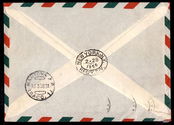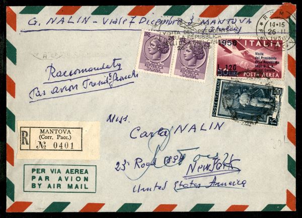 1956 Visita del Presidente in USA - aerogramma raccomandato con Aerea 120 lire su 50 + Italia al Lavoro 15 lire + Siracusana coppia 25 lire con annullo speciale e bollo d'arrivo