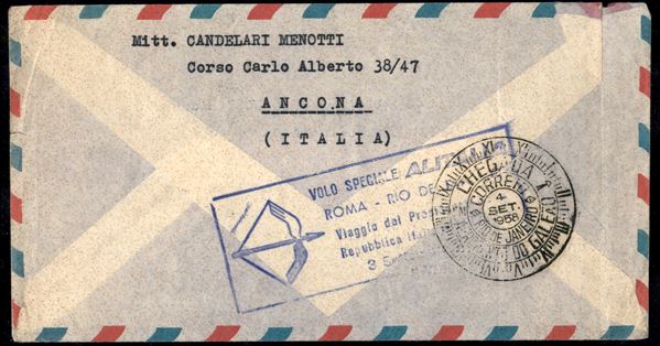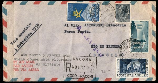 1958 - Volo speciale per il Brasile - aerogramma raccomandato con affrancatura quattro colori