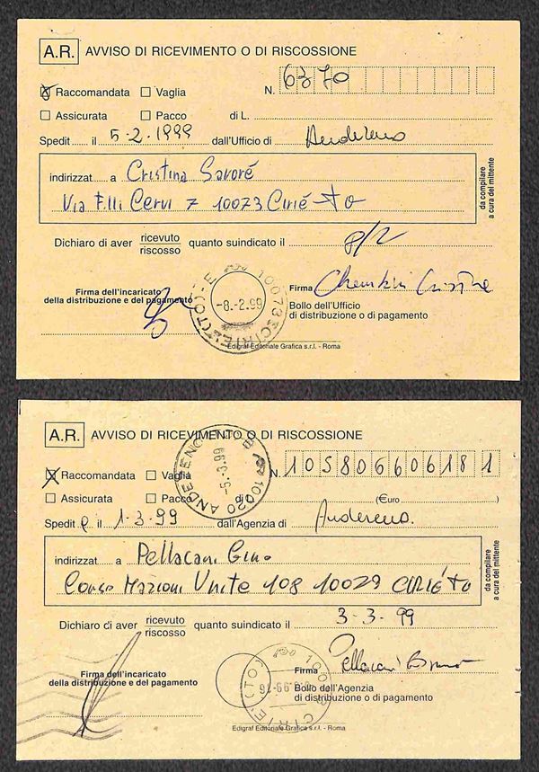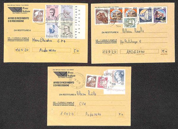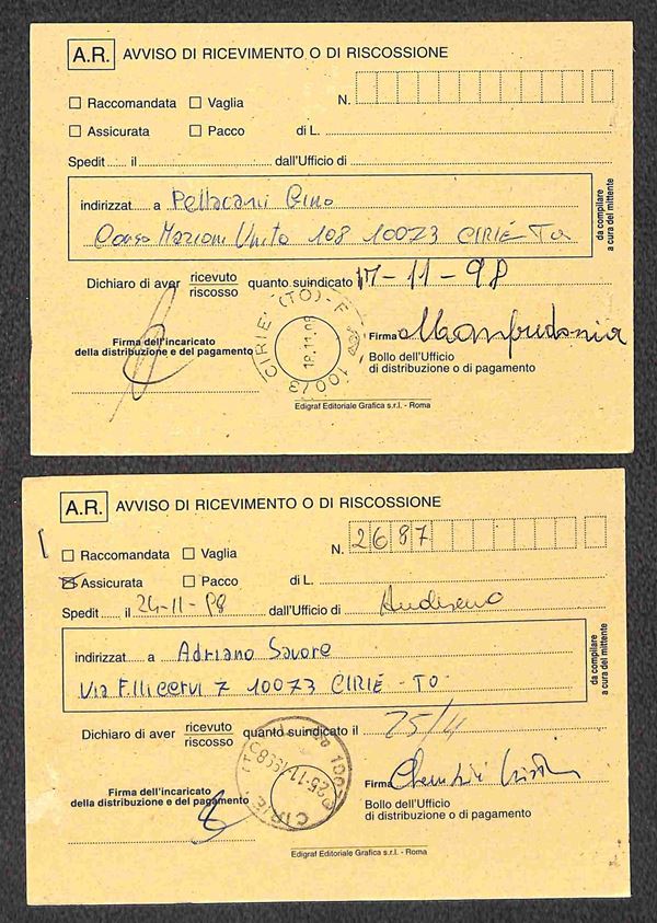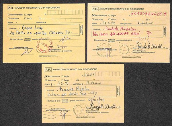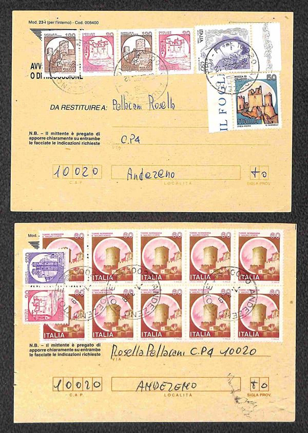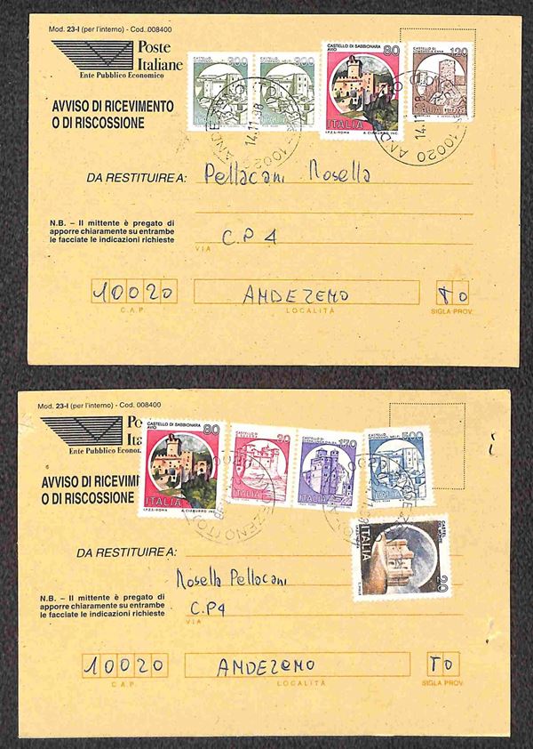 1998/1999 - Sette ricevute di ritorno affrancate con Castelli Macchinette + complementari in combinazioni differenti