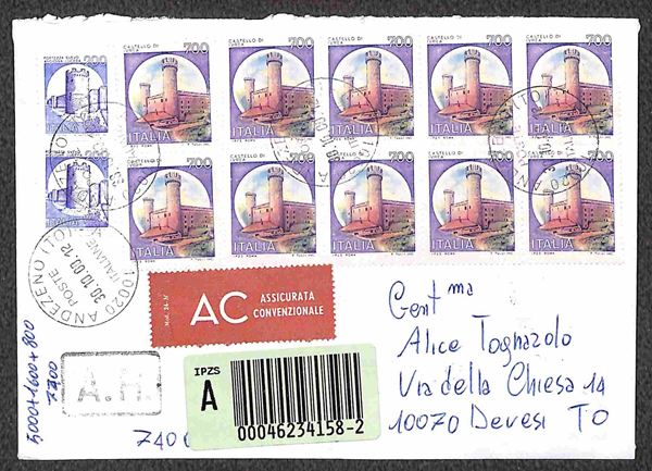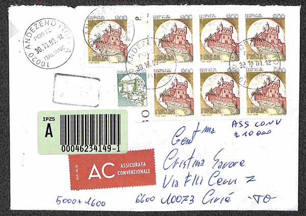 1998/2000 - Tre lettere assicurate o espresso con belle affrancature miste Castelli + Castelli Macchinette