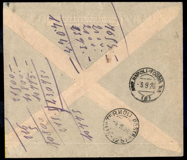 2 lire Floreale + 40 cent S. Francesco + 70 cent Espressi (150 + 194 + Espressi 11) su raccomandata espresso da Napoli per Termoli del 3.9.26 - bustina rifilata a destra